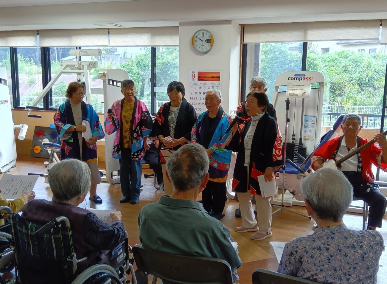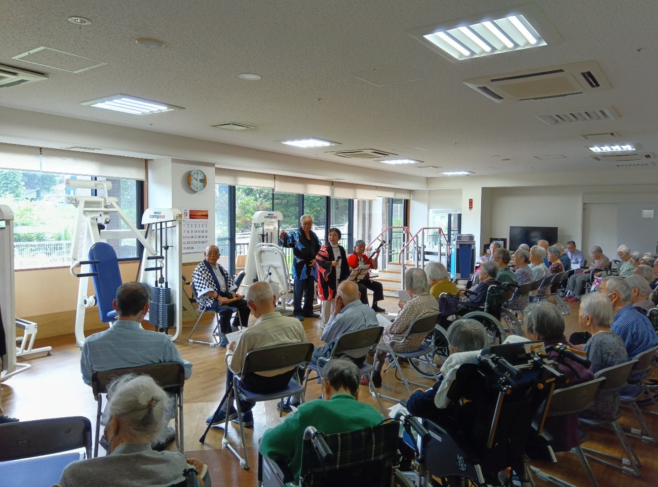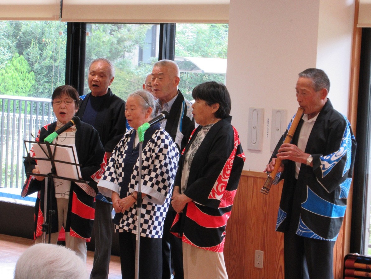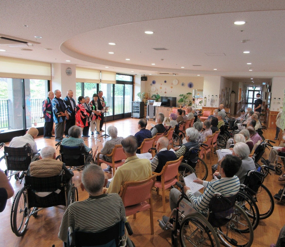 本館・ナーシングケアレジデンスと南館にて民謡鑑賞会が開催されました! 今年の敬老会は「青楓会」さん に民謡を披露していただきました! 南館では三味線の演奏があり、お客様は大変よろこばれております! 「青楓会」の皆様、ありがとうございました!